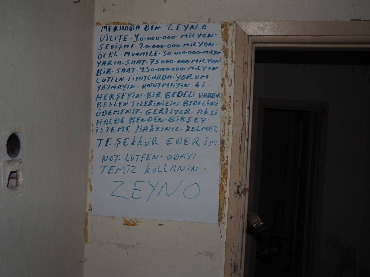 Her odanın kapısında dışarıdan kilitlenmek üzere sürgülü kilitler var. Hemen hemen her odada bulunan yatakların karşısında ve odaların tavanında duvarı kaplayan aynalar yaşananların sessiz tanığı olarak terk edilmiş.