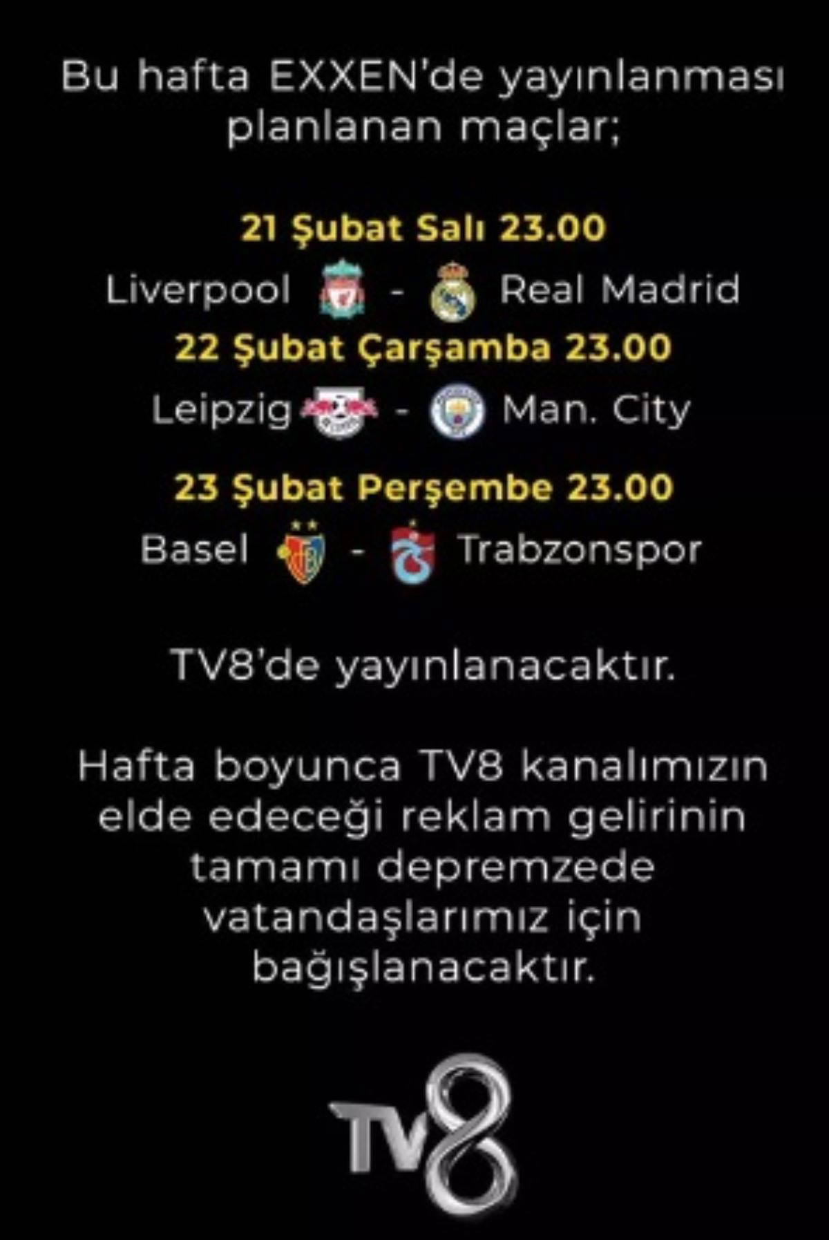 EXXEN platformunda yayınlanan maçların bu hafta TV8'de yayınlanacağını duyuran Acun Ilıcalı, hafta boyunca TV8 kanalının elde edeceği reklam gelirinin tamamının depremzede vatandaşlar için bağışlanacağını duyurdu.