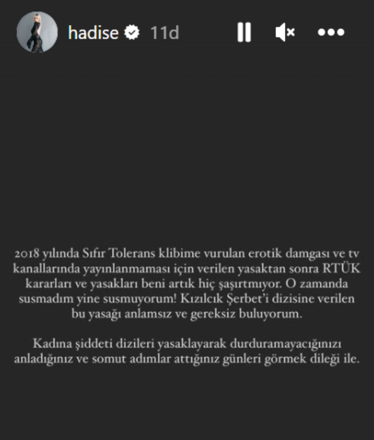 Hadise Kızılcık Şerbeti dizisine RTÜK tarafından verilen haksız karara tepki gösterdi. Ünlü şarkıcı kendisinin de geçmişte “Sıfır Tölerans” şarkısına getirilen yasağı hatırlattı ve şu yazılı açıklamayı yayınladı: