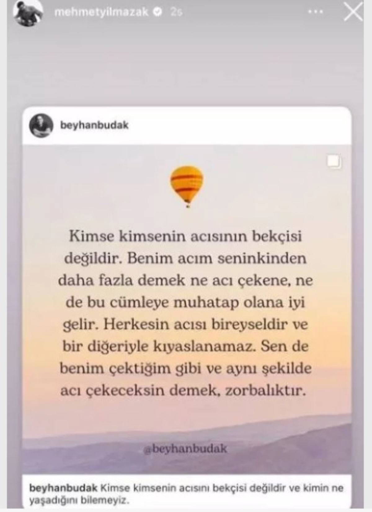 Oyuncu, klinik psikolog Beyhan Budak'ın "Kimse kimsenin acısının bekçisi değildir" cümlesi ile başlayan sözlerini Instagram hesabı üzerinde yayınladı.