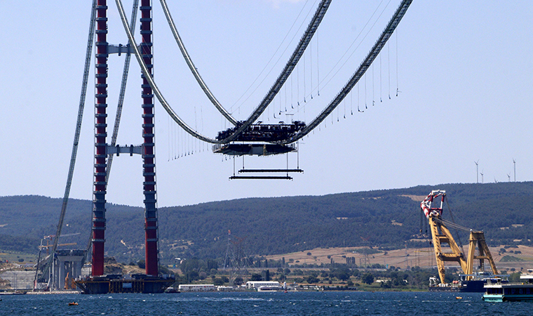 1915 Çanakkale Köprüsü'nün yolunu oluşturacak, her biri 45 metre genişliğinde, 48 metre uzunluğunda ve 700 ton ağırlığındaki mega tabliye bloklarının bağlanacağı askı halatlarının ana halatlara montajı devam ediyor. Cumhuriyetin kuruluşunun 100'üncü yılını simgeleyen köprünün 2 kule arasındaki 2023 metre uzunluğa sahip orta açıklığına ilk mega tabliye blok montajı yapıldı. Gemiyle getirilen mega tabliye bloku, ana halatlar üzerine geçen günlerde montajı yapılan kaldırma vinci ile yukarı kaldırılarak konuldu.