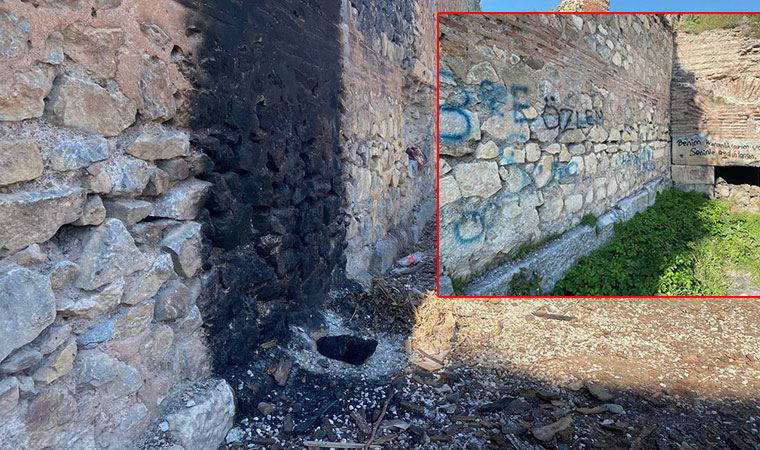 Bursa’nın İznik ilçesinde 2 bin 500 yıllık surlara daha önce sprey boyayla yazılar yazan magandalar, şimdi ise surları yakmaya çalıştı.