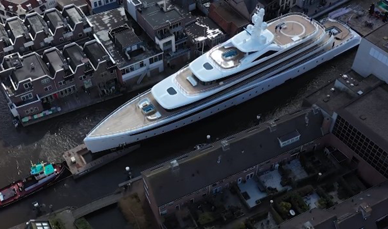 Hollanda’da Kaag Adası’nda inşa edilen 94 metre uzunluğundaki lüks yat, römorkörler eşliğinde ülkenin en dar kanallarından geçerek Rotterdam’a götürüldü.