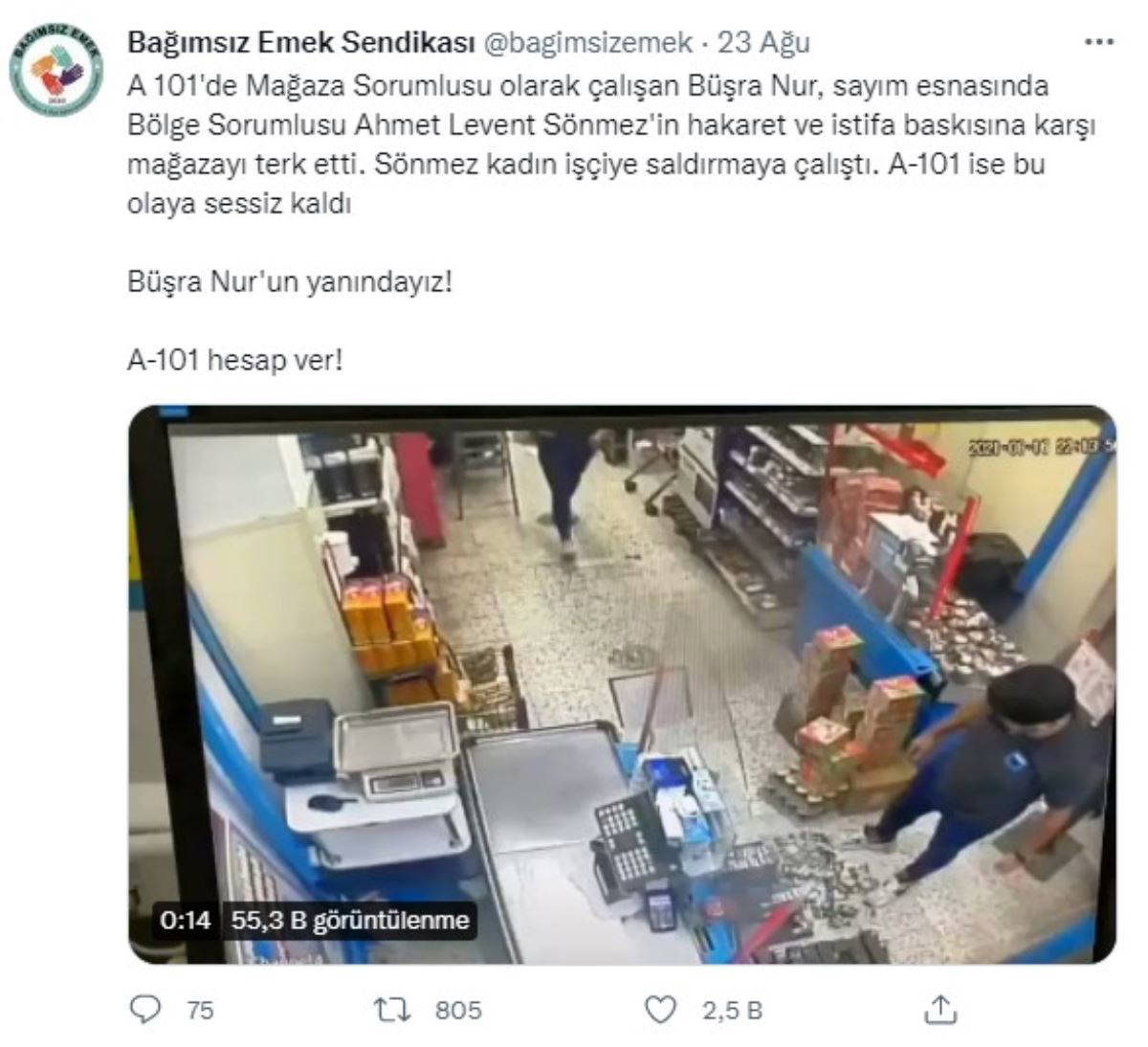 Bağımsız Emek Sendikası, sosyal medya hesabı Twitter üzerinden A-101'de Mağaza Sorumlusu olarak çalışan Büşra Nur isimli bir kadının, Bölge Sorumlusu Ahmet Levent Sönmez tarafından saldırıya uğradığını belirterek o anlara ilişkin videoyu paylaştı.