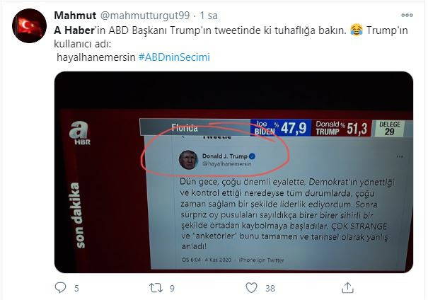 Trump’un gerçek hesaptan yaptığı açıklamayı Türkçe olarak yayınlanan ve @hayalhanemersin nickli sahte hesabı, A Haber’in dikkate alması sosyal medyada büyük yankı uyandırdı.
