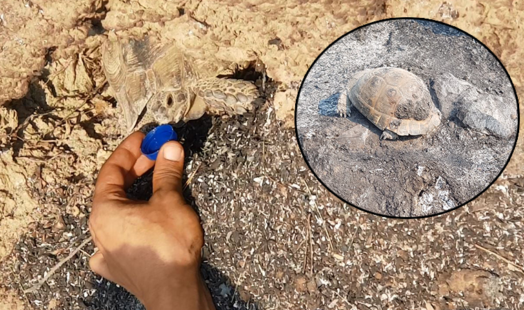 Türkiye'nin farklı bölgelerindeki orman yangınlarının büyük bölümü söndürülürken, devam eden yangınları söndürme çalışmaları da sürdürülüyor. Yerleşim yerlerini ve insan canını tehdit eden yangınlar, ormanlarda yaşayan binlerce hayvanı da olumsuz etkiledi. Manavgat'ta alevler arasında kalan kaplumbağa, ağaç kovuğuna girerek, yara almadan kurtuldu. Doğa Koruma ve Milli Parklar Genel Müdürlüğü ekipleri, söndürme çalışmalarının ardından soğutma çalışmaları sırasında ağaç kovuğundaki kaplumbağayı fark etti. Ekipler, kaplumbağayı bulunduğu yerden çıkarıp, pet şişe kapağında su içirdi. Görevlilerin yaptığı kontrolde, kaplumbağanın alevler ve dumandan etkilenmediği belirlendi. Ekipler, tamamen küle dönen alanda mucize eseri kurtulan kaplumbağayı güvenli alana götürüp, doğaya bıraktı.