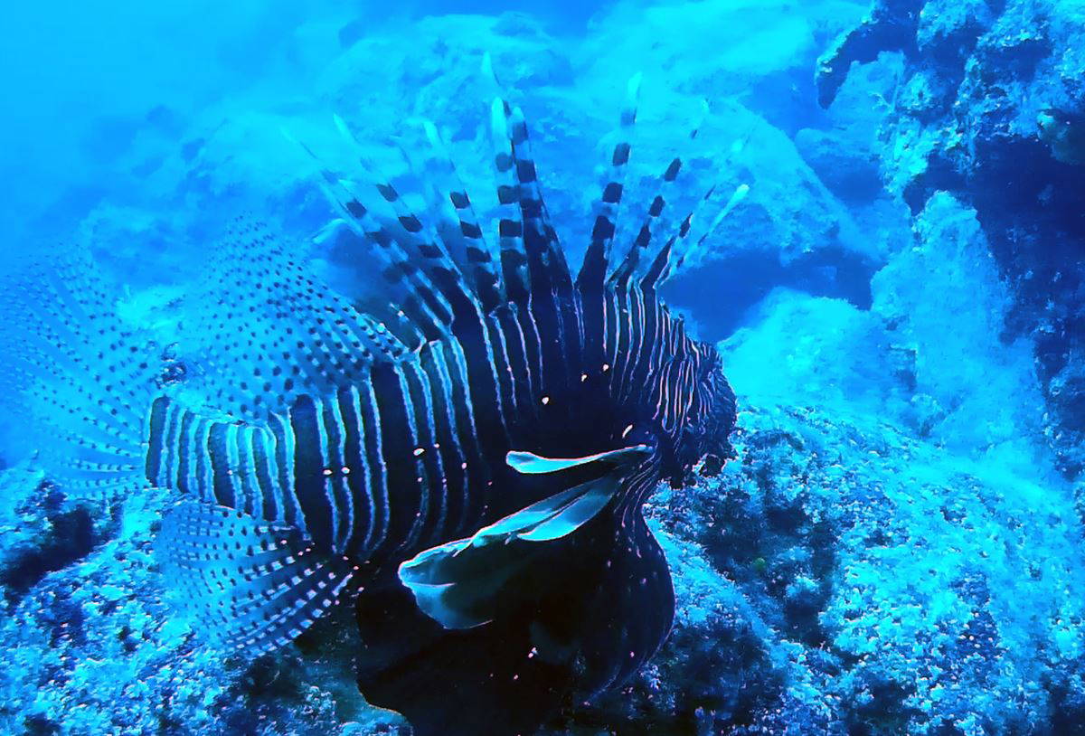 Falezlerin altına yaptığı bir dalış sırasında karşılaştığı aslan balığı sürüsünü görüntüleyen dalgıç Erkun Tanyar'ın elindeki kameradan korkarak yüzlerini kayalıklara dönen aslan balıkları, savunma pozisyonuna geçti. Bir süre hareketsiz durup tehlikenin geçmesini bekleyen balıklar, ardından yüzmeye devam ederek kayalıkların arasında gözden kayboldu.
