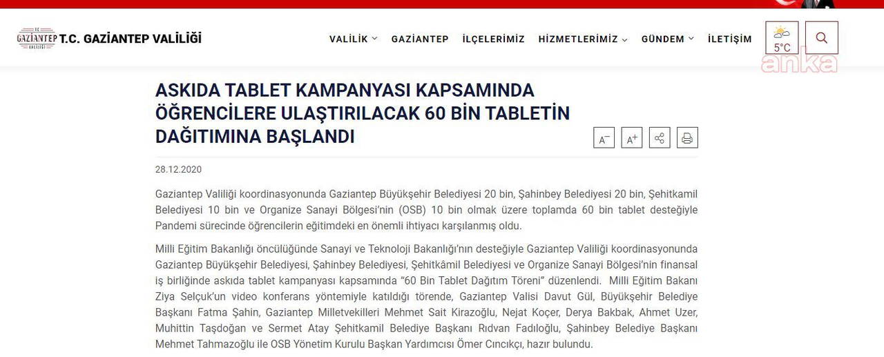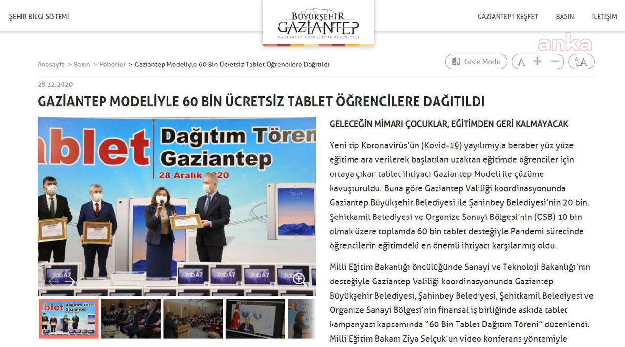 Cumhurbaşkanı Erdoğan’ın Şahinbey Belediyesi’yle ilgili verdiği 50 bin tablet sayısıyla ilgili olarak da çelişki ortaya çıktı. Gaziantep Valiliği ve Gaziantep Büyükşehir Belediyesi’nin Askıda Tablet Kampanyası’na ilişkin kendi kurumsal web sitelerinde yer alan haberlerde, Şahinbey’in dağıttığı tablet sayısı 20 bin olarak açıklandı. Haberlerde yer verilen sayıya göre Gaziantep Büyükşehir Belediyesi 20 bin, Şahinbey Belediyesi 20 bin, Şehitkamil Belediyesi 10 bin ve Organize Sanayi Bölgesi’nden de (OSB) 10 bin olmak üzere toplamda 60 bin tablet dağıtıldı.