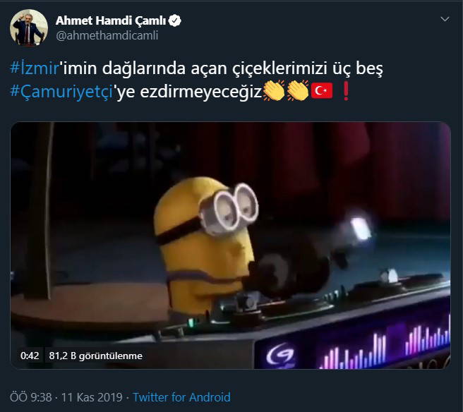 İzmir Marşı çalınırken bir anda kapatılıp AKP Genel Başkanı ve Cumhurbaşkanı Tayyip Erdoğan’ın seçim şarkısının çalındığı video yayımlayan AKP'li vekil Ahmet Hamdi Çamlı “#İzmir'imin dağlarında açan çiçeklerimizi üç beş #Çamuriyetçi'ye ezdirmeyeceğiz” mesajını paylaştı.