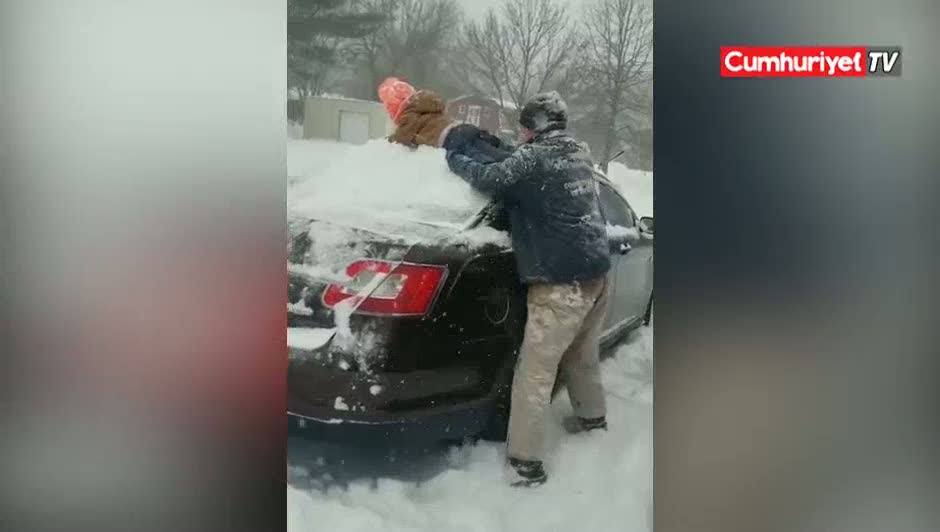 ABD'de bir baba, çocuğunu kar temizleme aparatı olarak kullanarak üzeri karla kaplı arabasını temizledi.