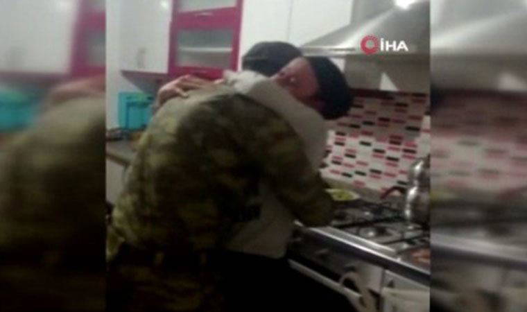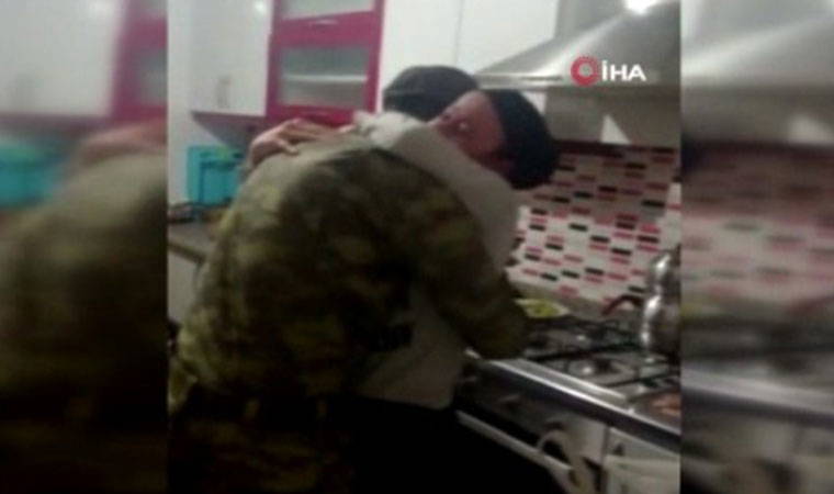 Görüntülerde, oğlunu asker kıyafetleri ile karşısında gören Gülhan Demir, şaşkına döndü. Oğluna defalarca sarılan anne şaşkınlıktan ne söyleyeceğini bilemezken evde o anları akrabaları dakika dakika kayda aldı.