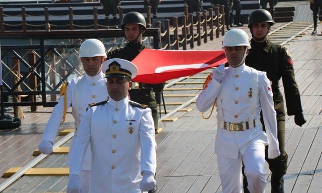 Deniz ve kara askerleri, 19 Mayıs 1919 tarihinde Milli Mücadele’yi başlatmak üzere karaya çıkan Mustafa Kemal Atatürk ve silah arkadaşlarının karaya çıkışını canlandırdı. Askerlerin ellerinde karaya çıkarılan Türk bayrağı, izci kıyafetli öğrenciler arasında değişimin yapılmasından sonra Samsun Valiliği tören alanına götürüldü.