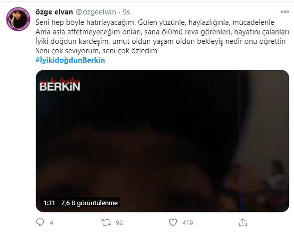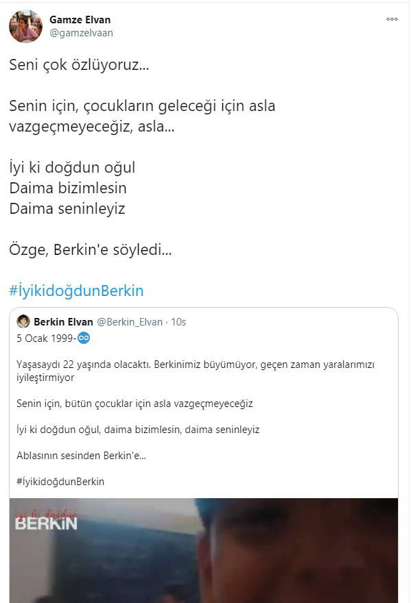Ailesi tarafından sosyal medyada Berkin Elvan'ın doğum günü için ablasının sesinden, Grup Yorum'a ait "nenni" türküsünün seslendirildiği bir video paylaşıldı.