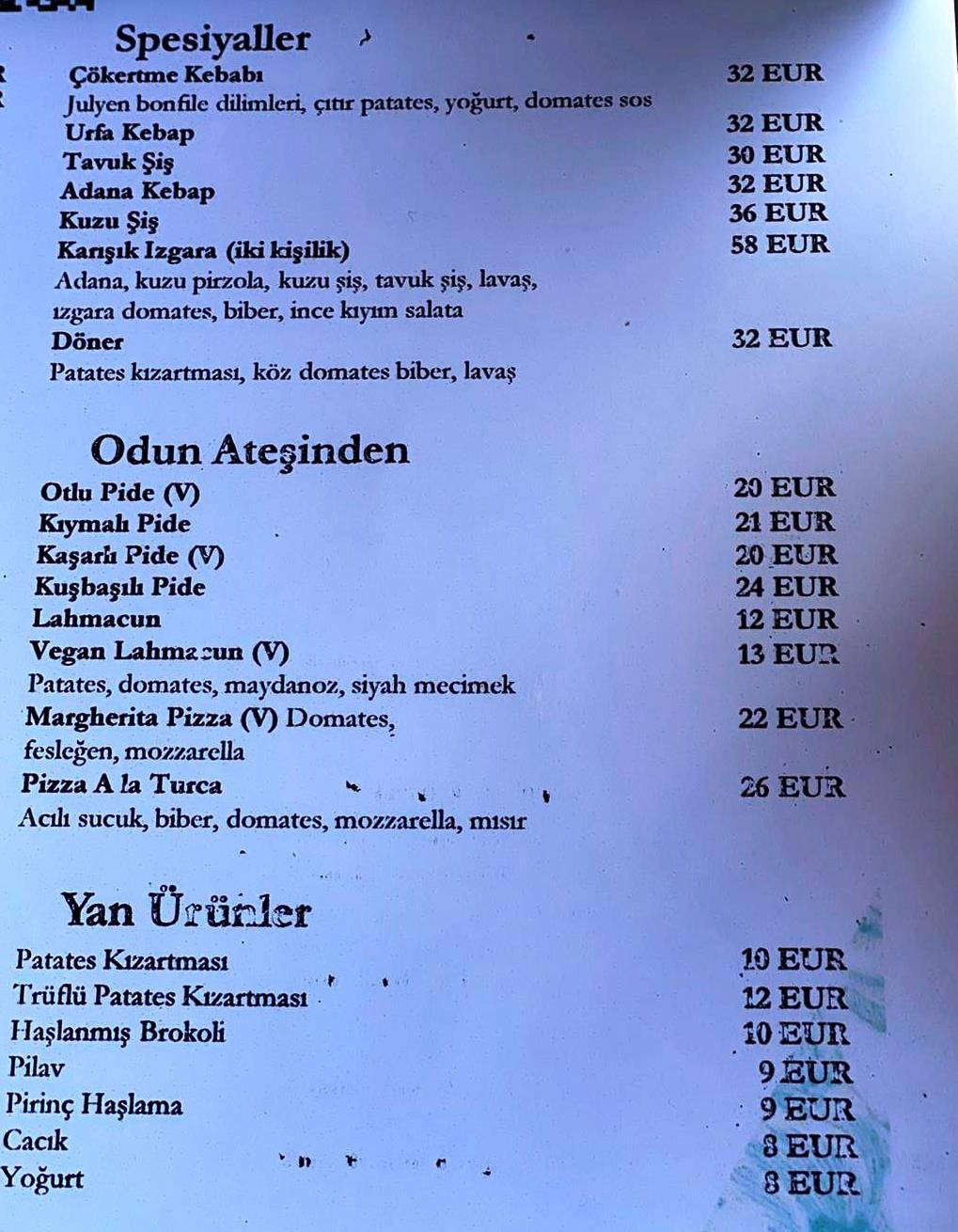 Dudak uçuklatan fiyat menüsünde bir şişe su 52 liradan, mercimek çorbası 107 liradan, lahmacun 90 liradan ve mantı ise 150 liradan satılıyor. Bir Adana dürümün tabakta servisi ise 245 lira. Ayranın 40 liradan, gazlı içeceklerin 62 liradan, sıkma portakal suyunun ise 86 liradan satıldığı restorandaki fahiş fiyatlar şaşırttı. Bodrum yarımadasında bulunan çoğu işletmede ise bir çorbanın 15 liradan, mantının 35 liradan, lahmacun 10 ve Adana menü 30 liradan satılıyor.