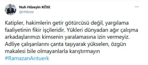 Hakim Nuh Hüseyin Köse, sosyal medyada başlayan tartışmaya katılarak adliye emekçilerine destek verdi. Hakim Köse, “Katipler, hakimlerin getir götürcüsü değil, yargılama faaliyetinin fikir işçileridir. Yükleri dünyadan ağır çalışma arkadaşlarımızı kimsenin yaralamasına izin vermeyiz. Adliye çalışanlarını çanta taşıyarak yükselen, özgün makalesi bile olmayanlarla karıştırmayın” dedi.