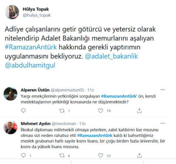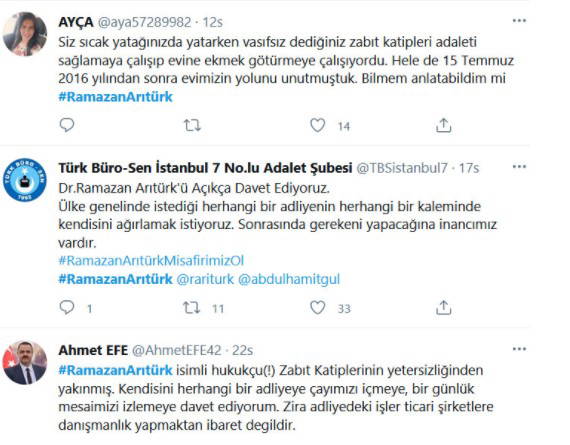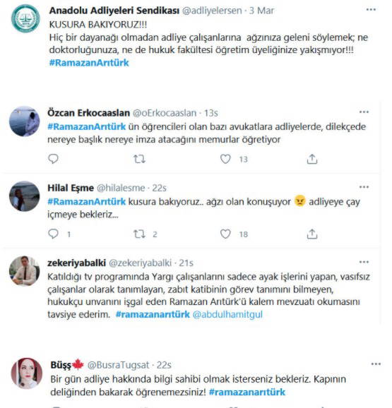 Açıklamada, şöyle denildi: “Arıtürk'ün yaptığı bu mesnetsiz ve talihsiz açıklamayı kınıyoruz. Dile getirdiği ve sorun olarak yansıttığı bu iddiaları, akademik hayatın kronik bir sorunu olarak görüyor; sahada yaşanan problemleri akademik değerlendirmelerinde dile getirdiklerinde, yeterli bilgi olmadan söyleme döktüklerini görüyoruz. Dünya genelinde yaşanan Covid-19'un getirdiği pandemi sürecinde karşılıksız fedakarlıkla görev yapan Zabıt Katiplerinin bu emeğinin karşılığının maddi bir değerlendirmesi yoktur. Adalet sisteminin işlemesini pandemiye rağmen göğüslemiş ve sistemin çarklarının dönmesini sağlamıştır. Tüm bu bilgilere vakıf olmayan Dr. Ramazan Arıtürk, mahkeme kalemlerinde çalışan zabıt katiplerinin ancak getir götürünü yapar.”
