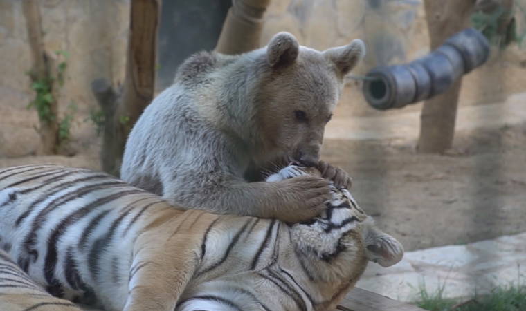 Vahşi yaşamda birbirlerinin düşmanı olan kaplanlar ve ayının dostluğu görenleri şaşkına çeviriyor. Çekmeköy’de bulunan hayvanat bahçesindeki Ayı Silva ve Kaplan Kimbo’nun yüzünden bal yalaması izleyenleri gülümsetti.
