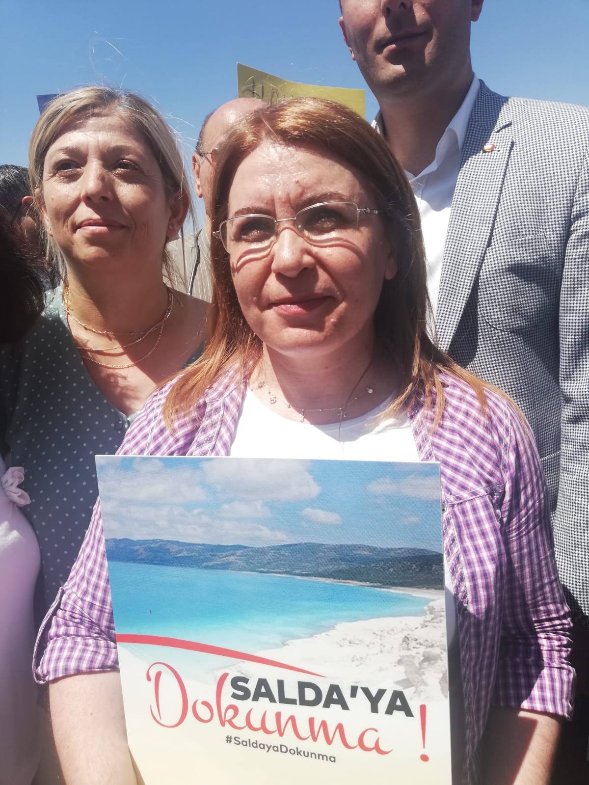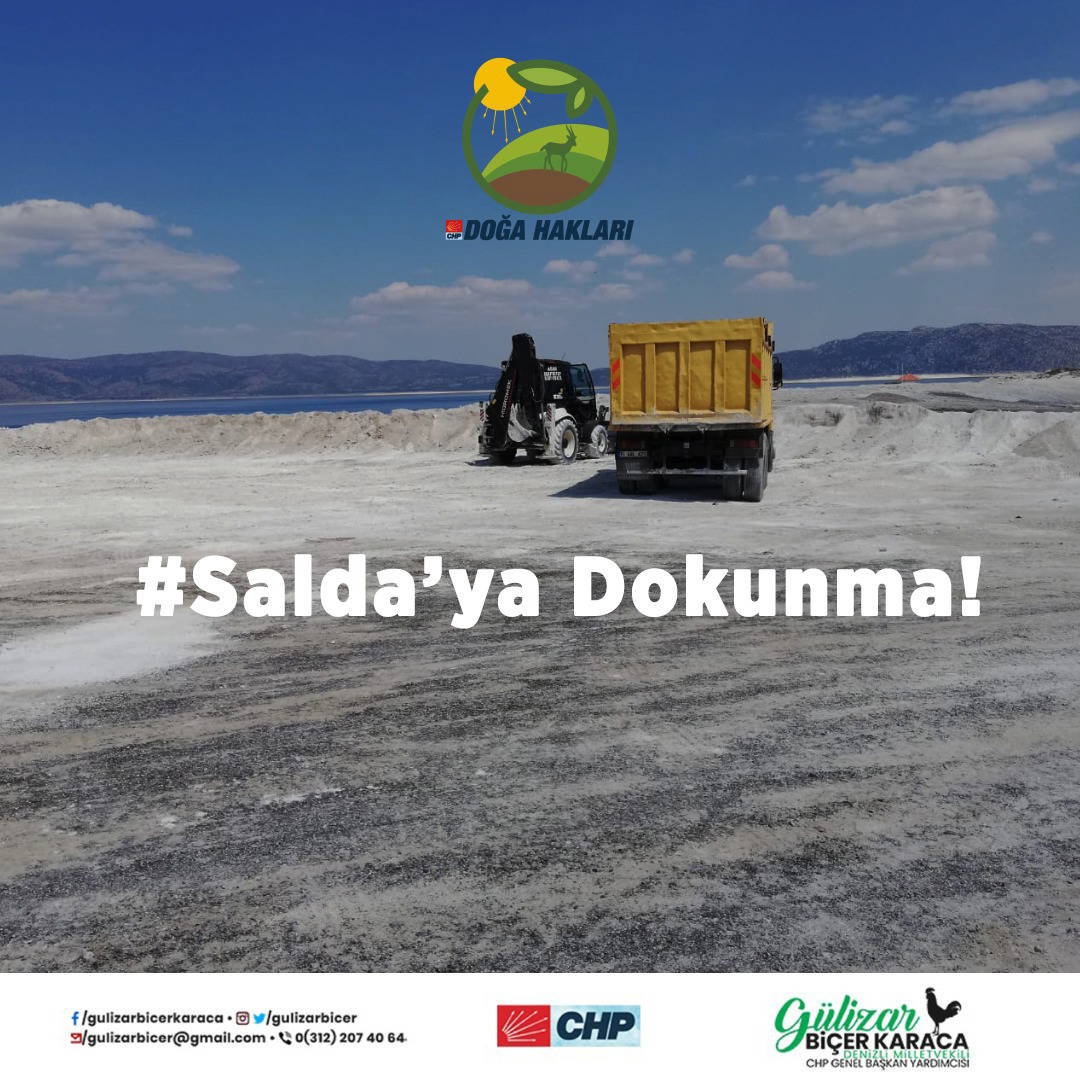 CHP Doğa Haklarından Sorumlu Genel Başkan Yardımcısı, Denizli Milletvekili Gülizar Biçer Karaca, Salda Gölü'nün beyaz kumlarının taşınmasına tepki gösterdi. Karaca, “Kamyonlarla, iş makinalarıyla girdiğiniz o beyaz kumlar, tarihi 3,7 milyar yıl öncesine dayanan, canlı organizmalar. Çevre ve Şehircilik Bakanlığı, Sarayın 'Millet Bahçesi' emrini yerine getirmek için cinayet işliyor" açıklamasını yaptı.