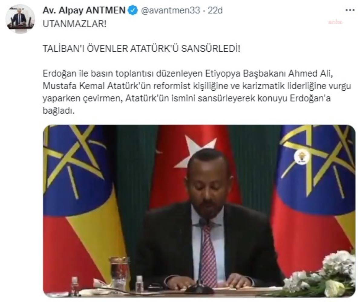 "Utanmazlar! Taliban'ı övenler, Atatürk'ü sansürledi. Erdoğan ile basın toplantısı düzenleyen Etiyopya Başbakanı Ahmed Ali, Mustafa Kemal Atatürk'ün reformist kişiliğine ve karizmatik liderliğine vurgu yaparken çevirmen, Atatürk'ün ismini sansürleyerek konuyu Erdoğan'a bağladı."