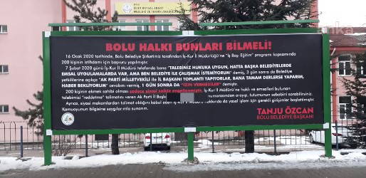 Talebe bakanlığın izin verdiğini bildiren Bolu Belediye Başkanı Tanju Özcan ise il başkanını aradığını İŞKUR İl Müdürünün kendisinden talimat beklediğini söyledğini anlattı. Özcan,"Defalarca uyardık en sonunda müdür dönüş yaptı ve izin vermediklerini söyledi. Ne yaptık bunun üzerine billboardlara çıktık. Olayları özetledik" dedi.