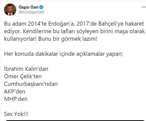 CHP'li Özel katıldığı Halk TV programında, "Bu adam 2014'te Erdoğan'a, 2017'de Bahçeli'ye hakaret ediyor. Kendilerine bu lafları söyleyen birini maşa olarak kullanıyorlar! Bunu bir görmek lazım" açıklamasında bulundu. Özel, İbrahim Kalın ve Ömer Çelik'in sessizliğine de dikkat çekti.