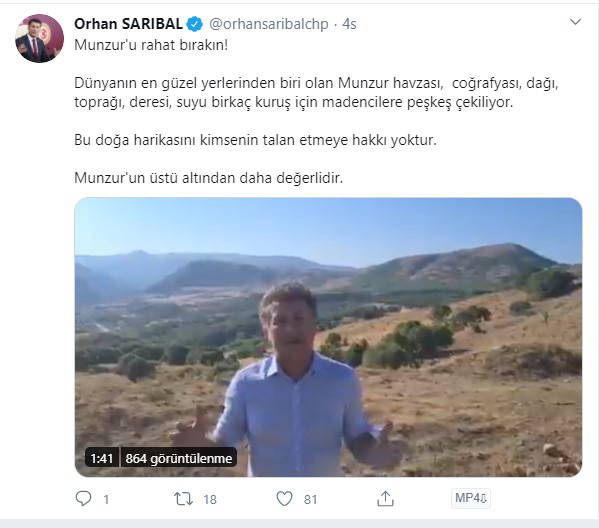 Sarıbal, sosyal medya hesabı Twitter üzerinden konuya ilişkin tepki gösterdiği videoyu paylaştı. Sarıbal paylaşımında "Dünyanın en güzel yerlerinden biri olan Munzur havzası, coğrafyası, dağı, toprağı, deresi, suyu birkaç kuruş için madencilere peşkeş çekiliyor. Bu doğa harikasını kimsenin talan etmeye hakkı yoktur. Munzur'un üstü altından daha değerlidir." tepkisinde bulundu.