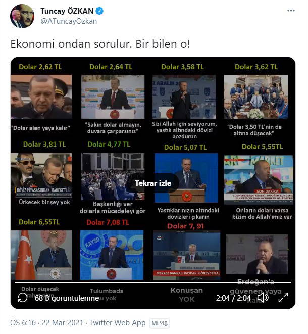CHP Genel Başkan Başdanışmanı ve İzmir Milletvekili Tuncay Özkan 2 dakika 4 saniyelik; toplamda 12 video ile Cumhurbaşkanı ve AKP Genel Başkanı Erdoğan'a dolar ile ilgili sözlerini hatırlattı.