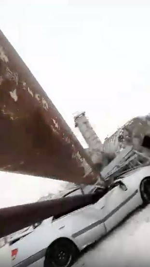 Rusya'ya bağlı Sibirya Bölgesinde bulunan Tomsk şehrinde çimento fabrikasının bir kısmında onarım çalışması yapıldığı sırada bir araç sahibinin başına gelmeyen kalmadı. Çimento fabrikasının siloları onarım için boşaltılırken hemen yanında bulunan depolama alanında güçlendirme çalışmaları başlatıldı. İşçiler depolama alanının çatısındaki metalleri vinçler yardımıyla çekmeye çalışırken fabrikanın siloları bir anda yan yatmaya başladı. Bu sırada aracı fabrikanın hemen yanında bulunan kişi cep telefonuyla çekim yaparken siloların aracının üstüne devrilmeye başladığını görünce bağırarak aracının yanına koştu.