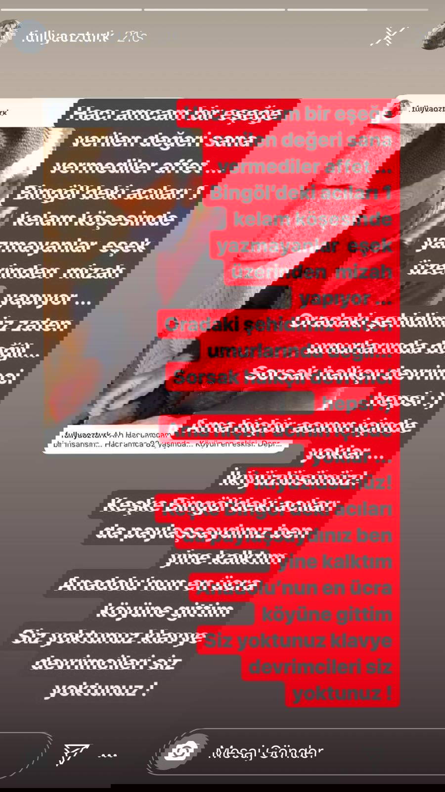 ''Hacı amcam bir eşeğe verilen değeri sana vermediler affet... Bingöl'deki acıları bir kelam köşesinde yazmayanlar eşek üzerinden mizah yapıyor... Oradaki şehidimiz zaten umurlarında değil... Sorsak halkçı devrimci hepsi... Ama hiçbir acının içinde yoklar...İki yüzlüsünüz! keşke Bingöl'deki acıları da paylaşsaydınız ben yine kalktım Anadolu'nun en ücra köyüne gittim. Siz yoktunuz klavye devrimcileri siz yoktunuz!''
