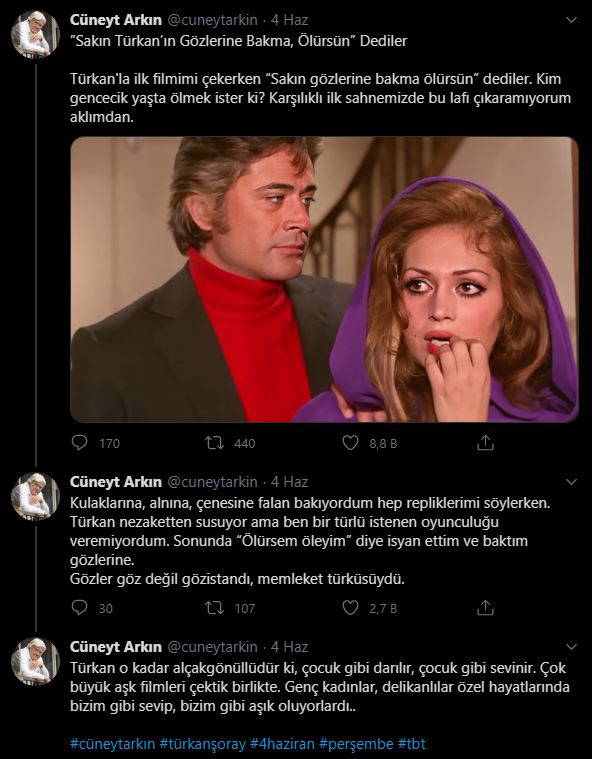 Yeşilçam’ın duayen ismi Cüneyt Arkın, Instagram hesabından yaptığı paylaşımla dikkat çekti. Türkan Şoray’ın gözleri ile ilgili bir anısını anlatan Arkın, bir süre Türk sinemasının Şoray'ın gözlerine hiç bakamamış, çünkü ona “Gözlerine bakma ölürsün” demişler…