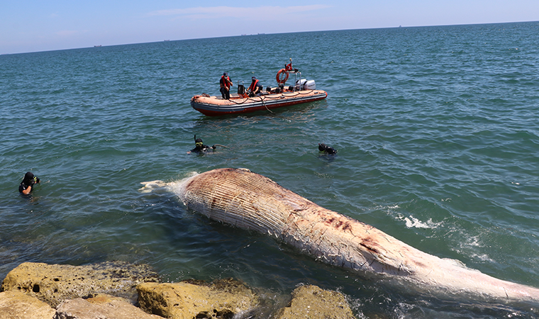 Edinilen bilgiye göre, merkez Yenişehir ilçesi Adnan Menderes Bulvarı açıklarında devriye atan Sahil Güvenlik Akdeniz Bölge Komutanlığı ekipleri, dev bir cismin karaya doğru ilerlediğini fark etti. Bunun üzerine bölgeye doğru hareketlenen ekipler, cismin ölen dev bir balina olduğunu gördü. Ardından ölü balinayı karaya kadar takip eden ekipler, durumu polis ve itfaiye ile Tarım İl Müdürlüğü ekiplerine bildirdi. Yaklaşık 8 metre boyunda, 800 metre uzunluğundaki balina, Kushimoto Sokağı karşısındaki sahile vurdu. Balığın yaklaşık bir hafta önce öldüğü düşünülürken, kafasının da büyük zarar gördüğü görüldü. Çok büyük olmasından dolayı vinçle çıkarılması gereken balık, Sahil Güvenliğin balık adamları tarafından halatlarla bağlanarak, bota bağlanıp uygun yere çekilmesi sağlandı. Mersin Üniversitesi Su Ürünleri Fakültesi İşleme Teknolojisi Anabilim Dalı Öğretim Üyesi Prof. Dr. Deniz Ayas'da dünyanın en büyük ikinci balinası olan balığın bulunduğu bölgeye gelerek, incelemelerde bulundu. Bölgede yoğun bir koku oluşurken, çevrede bulunan apartmanlardaki vatandaşlarda meraklı gözlerle çalışmaları inceledi.
