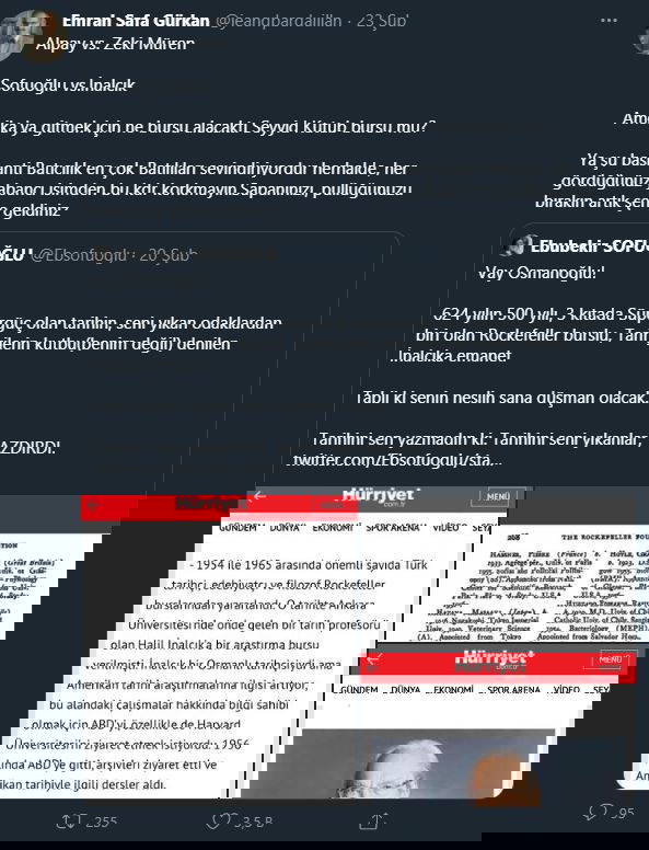 Bir diğer tarihçi Doç. Dr. Emrah Safa Gürkan da Sofuoğlu’nun tweetini alıntılayarak, “Alpay vs. Zeki Müren, Sofuoğlu vs. İnalcık, Amerika'ya gitmek için ne bursu alacaktı Seyyid Kutub bursu mu? Ya şu basit anti Batıcılık en çok Batılıları sevindiriyordur herhalde, her gördüğünüz yabancı isimden bu kdr korkmayın. Sapanınızı, pulluğunuzu bırakın artık şehre geldiniz” diye yazdı.