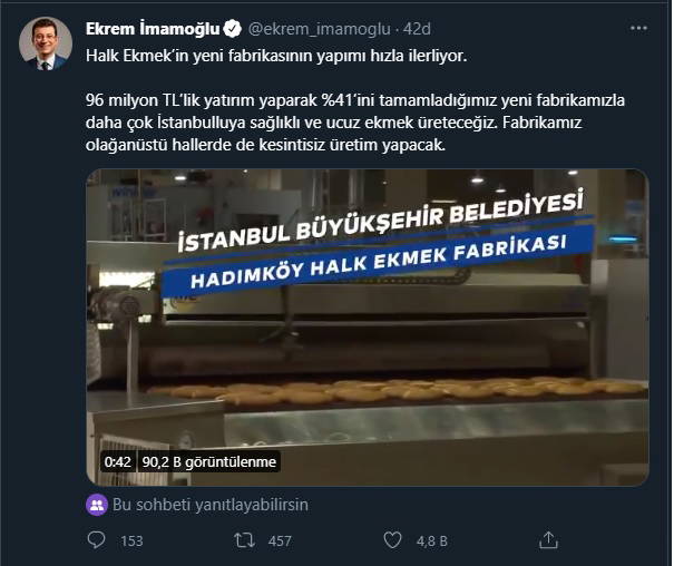 İBB Başkanı Ekrem İmamoğlu, Halk Ekmek'in Hadımköy'deki fabrikasına ilişkin yaptığı paylaşımda şunları belirtti:
