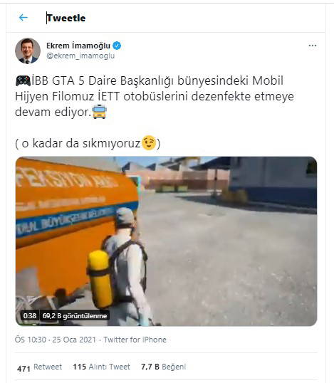 İstanbul Büyükşehir Belediye Başkanı Ekrem İmamoğlu, İETT otobüslerindeki dezenfekte ve hijyen çalışmalarını GTA 5 animasyonlarına gönderme yapılan bir video ile anlattı.