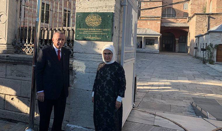 Cumhurbaşkanı Erdoğan dün saat 17.30'da Ankara'dan İstanbul'a geldi. Erdoğan, Atatürk Havalimanı'ndan Ayasofya Camii'ne geçti. Arka kapıdan giriş yapan Erdoğan son hazırlıkları inceledi. Cumhurbaşkanı Erdoğan'ın içeride olduğu sıralarda ses sistemi de denendi. Erdoğan'ın ardından MHP Genel Başkanı Devlet Bahçeli de Ayasofya Camii'ne geldi. Erdoğan ön kapıdan çıkış yaptı. Caminin ön kapısına asılan "Ayasofya Kebir Cami-i Şerifi" yazılı tabelayı Cumhurbaşkanı Erdoğan açtı. Tabelanın Türkçe ve İngilizce olduğu görülüyor. Erdoğan burada fotoğraf da çektirdi. Cumhurbaşkanı Erdoğan Ayasofya Camii'nde 1 saati aşkın süre incelemelerde bulunduktan sonra buradan ayrıldı.
