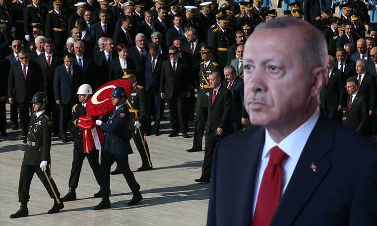 Cumhurbaşkanı Recep Tayyip Erdoğan başkanlığındaki devlet erkanı, saat 11.00'da 29 Ekim Cumhuriyet Bayramı nedeniyle, Anıtkabir'ı ziyaret etti. Törenin ardından Anıtkabir, halkın ziyaretine açıldı. Anıtkabir'de düzenlenen resmi törene Cumhurbaşkanı Recep Tayyip Erdoğan'ın yanı sıra, Türkiye Büyük Millet Meclisi Başkanı (TBMM) Mustafa Şentop, Cumhurbaşkanı Yardımcısı Fuat Oktay, CHP Genel Başkanı Kemal Kılıçdaroğlu, İYİ Parti Genel Başkanı Meral Akşener, bakanlar, Genelkurmay Başkanı Orgeneral Yaşar Güler ile kuvvet komutanları, yüksek yargı üyeleri ve askeri personel katıldı. Cumhurbaşkanı Erdoğan ve beraberindekiler, Aslanlı Yol'dan yürüyerek Atatürk'ün mozolesine geldi. Cumhurbaşkanı Erdoğan, üzerinde ay yıldız bulunan çelengi Atatürk'ün mozolesine bıraktıktan sonra saygı duruşunda bulunularak İstiklal Marşı okundu. Buradan Misak-ı Milli Kulesi'ne geçen Erdoğan, Anıtkabir Özel defterine şunları yazdı: "Aziz Atatürk; bugün millet olarak büyük bir heyecanla cumhuriyetimizin 96'ncı yıl dönümünü kutluyoruz. Bu gurur günümüzde zat-ı alinizi ve istiklal harbimizin tüm kahramanlarını, vatanımız uğruna can veren aziz şehitlerimizi rahmetle yad ediyor, gazilerimize şükranlarımızı sunuyoruz. Bağımsızlığımıza ve milli bekamıza yönelik saldırıların arttığı bir dönemde Kurtuluş Savaşımızı zafere taşıyan direniş ruhuyla yurt içinde ve yurt dışında mücadelemizi kararlılıkla sürdürüyoruz. 9 Ekim'de başlattığımız ve kısa sürede çok ciddi başarılara imza attığımız Barış Pınarı Harekatı'yla Suriye sınırımız boyunca kurulmak istenen terör koridorunu dağıtarak kararlılığımızı bir kez daha tüm dünyaya gösterdik. Ruhun şad olsun."