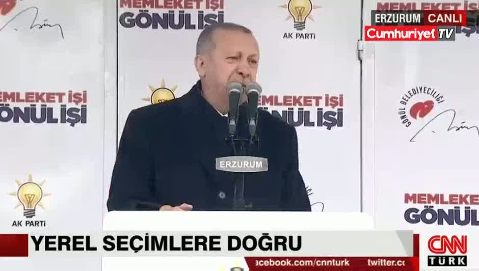 AKP'li Cumhurbaşkanı Recep Tayyip Erdoğan, Erzurum İstasyon Meydanı'nda halka hitap ettiği konuşmada, "Bu ülkeyi bölemeyecekler. Kürdistan Kuzey Irak'ta. Çok seviyorlarsa oraya gitsinler. Benim ülkemde Doğu Anadolu var, Güney Doğu Anadolu var, Karadeniz var, Ege var, Marmara var. Ama benim ülkemde Kürdistan diye bir bölge yok." ifadelerini kullandı.