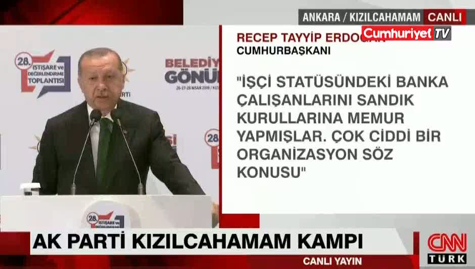 AKP'li Cumhurbaşkanı Recep Tayyip Erdoğan, Kızılcahamam Kampı'ndaki konuşmasında "Şeriatın kestiği parmak acımaz diyerek içimize sinse de sinmese de YSK kararına uyacağız. AK Parti umudunu kesti diyor. Son ana kadar biz hukuk mücadelemizi sürdüreceğiz. Bu normal yargı mücadelesinden ziyade seçim hukukuna yöneliktir. Milletimiz diyor ki İstanbul benim içime sinmedi. Bu şaibenin giderilmesi şart ki rahat edelim." ifaddelerini kullandı.