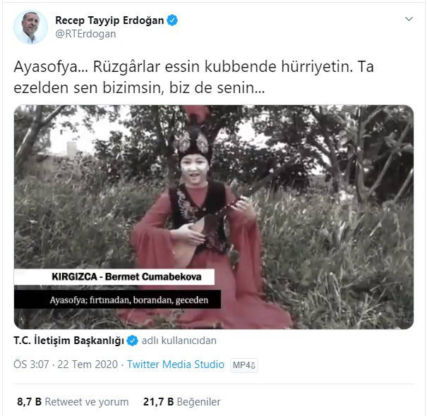 Ayasofya ile ilgili şarkılı bir video paylaşan Erdoğan, söz konusu paylaşımına, "Ayasofya... Rüzgârlar essin kubbende hürriyetin. Ta ezelden sen bizimsin, biz de senin..." notunu düştü.