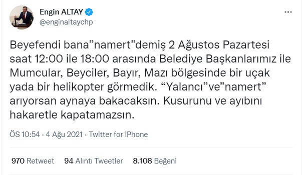 Erdoğan'ın hakaretine sosyal medya hesabı Twitter üzerinden yanıt veren Altay, "Beyefendi bana 'namert' demiş 2 Ağustos Pazartesi saat 12:00 ile 18:00 arasında Belediye Başkanlarımız ile Mumcular, Beyciler, Bayır, Mazı bölgesinde bir uçak yada bir helikopter görmedik. 'Yalancı' ve 'namert' arıyorsan aynaya bakacaksın. Kusurunu ve ayıbını hakaretle kapatamazsın." ifadelerini kullandı.