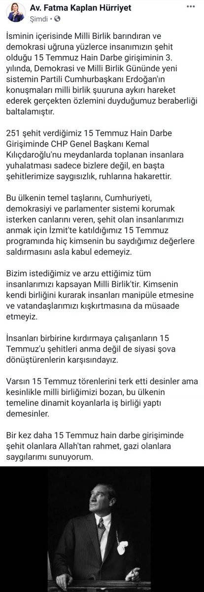 Cumhurbaşkanı Recep Tayyip Erdoğan, Atatürk Havalimanı'ndaki 15 Temmuz konuşmasında CHP lideri Kılıçdaroğlu'na yüklenince, Kocaeli’de demokrasi nöbetine katılan CHP’li İzmit Belediye Başkanı Fatma Kaplan Hürriyet, CHP’liler ve İYİ Partililer alanı terk etti.