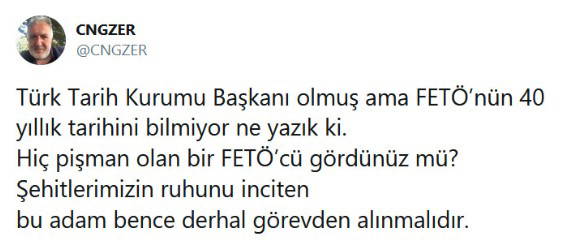 Gazeteci Cengiz Er, “Türk Tarih Kurumu Başkanı olmuş ama FETÖ’nün 40 yıllık tarihini bilmiyor ne yazık ki. Hiç pişman olan bir FETÖ’cü gördünüz mü? Şehitlerimizin ruhunu inciten bu adam bence derhal görevden alınmalıdır” mesajın paylaştı.