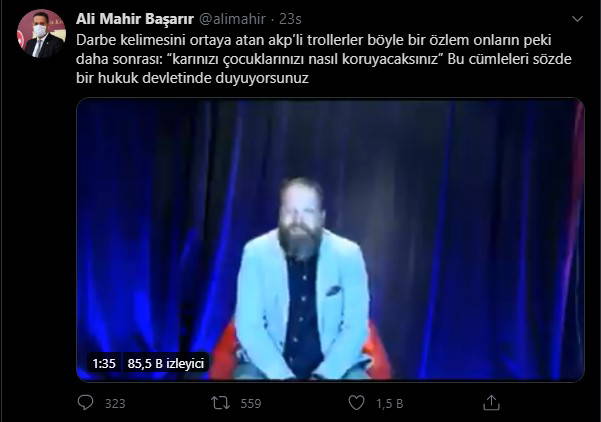 Cumhuriyet Halk Partisi Mersin Milletvekili Ali Mahir Başarır, Tezcan'ın söz konusu videosunu Twitter hesabından paylaşarak, "Darbe kelimesini ortaya atan AKP'li troller böyle bir özlem onların peki daha sonrası: “Karınızı çocuklarınızı nasıl koruyacaksınız” Bu cümleleri sözde bir hukuk devletinde duyuyorsunuz" dedi.