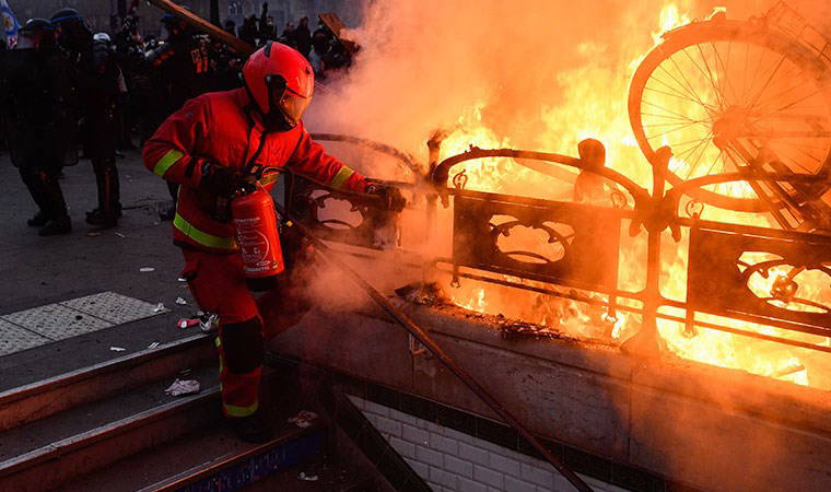Ülke genelindeki bir çok şehirden bir araya gelen itfaiyeciler, Paris sokaklarında yürüyüşe geçti. Polis, itfaiyecilerden trafiği engelledikleri gerekçesiyle yolu açmalarını isteyince çatışma çıktı. Gruba müdahale eden polis, itfaiyecileri dağıtmak için göz yaşartıcı gaz da kullandı.