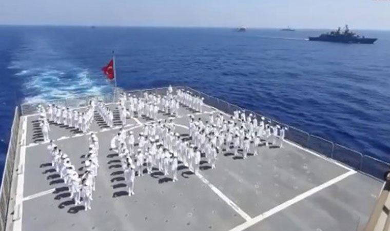 Milli Savunma Bakanlığı (MSB), açık deniz eğitimi alan Deniz Harp Okulu 3'üncü sınıf öğrencilerinin 'Mavi Vatan' yazarak Kuzey Kıbrıs Türk Cumhuriyeti'ni (KKTC) selamladıkları görüntüyü paylaştı.