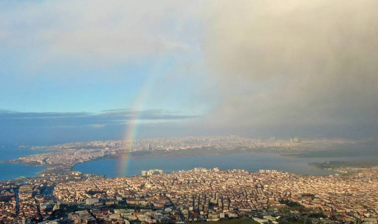 İstanbul’da sabah saatlerinde yer yer etkili olan yağmur, beraberinde gökkuşağının oluşmasına neden oldu. Havadan çekilen İstanbul semalarında oluşan gökkuşağı kartpostallık görüntüler oluştururken bir yandan ise karabulutların şehre doğru geldiği gözüktü.