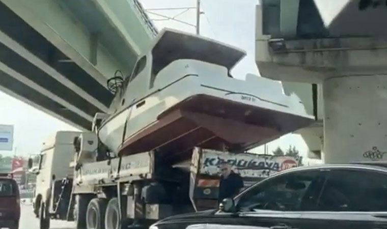 Trafikte vincin üzerindeki tekne, sürücünün yüksekliği hesaplayamaması sonucu viyadüğe takıldı. Olayın ardından vinç sürücüsü, başka bir vinç operatöründen yardım istedi. Diğer vincin gelmesinin ardından viyadüğe takılan tekne kurtarıldı. Yapılan kontrollerin ardından tekne tamirata götürülürken, ilginç anlar ise cep telefonu kamerasına yansıdı.