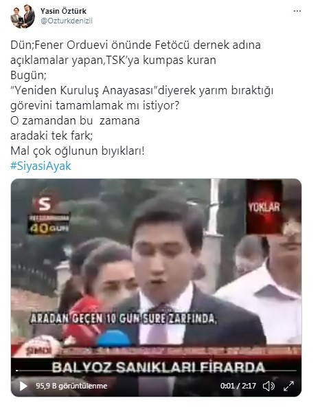 Öztürk sosyal medya hesabından yaptığı paylaşmda: "Dün;Fener Orduevi önünde Fetöcü dernek adına açıklamalar yapan,TSK’ya kumpas kuran bugün; “Yeniden Kuruluş Anayasası” diyerek yarım bıraktığı görevini tamamlamak mı istiyor? O zamandan bu zamana aradaki tek fark; mal çok oğlunun bıyıkları! #SiyasiAyak" ifadelerini kullandı.