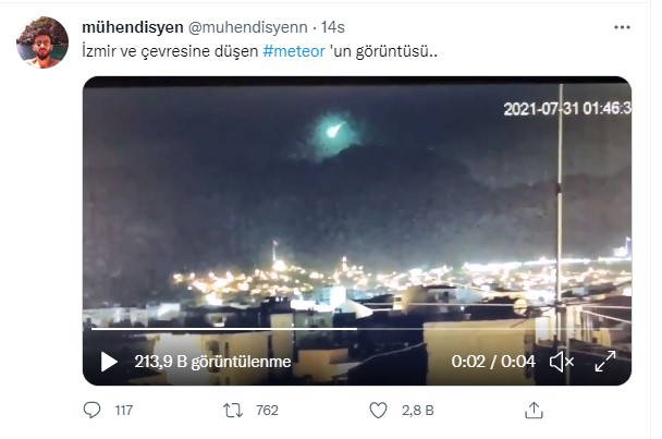 Bir Twitter kullanıcısı tarafından 'İzmir ve çevresine düşen meteorun görüntüsü' notuyla paylaşılan video, kısa sürede sosyal medyada gündem oldu.