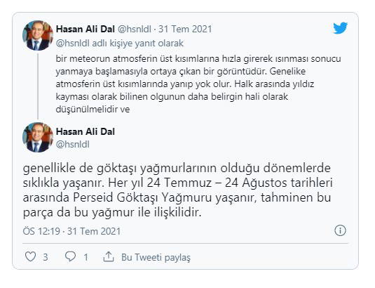 ?Ege Üniversitesi Gözlemevi Müdürü Doç. Dr. Hasan Ali Dal ise olayın perseid meteor yağmurundan bir parça olduğunu söyledi. Dal, "24 Temmuz'da başlayan perseid meteor yağmuru 24 Ağustos'a kadar devam edecek. Önümüzdeki günlerde bu sayı artacak" dedi.